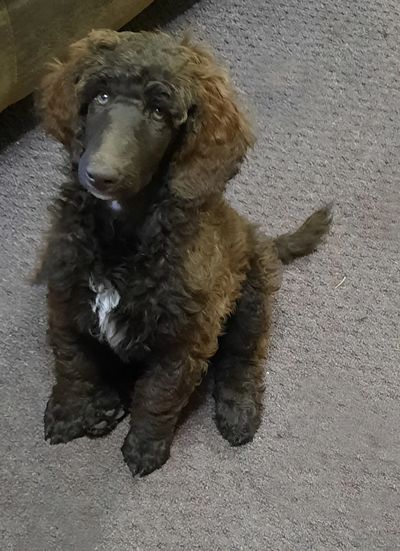 Her color genetics are kb/ky (possible kb/kbr) ay/ay, Em/e, bb, S/sp. So to break that down - she is brown and carries red and parti. As a young puppy, she had the interesting color mutation informally called "seal", which is a leaky kb allowing sable pattern to show through temporarily. By 8 months old she has lost the darker "seal" shading. She has an abstract chest marking which makes her multi-color.