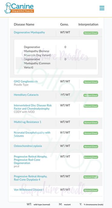 She is DNA clear for NEWS, DM, vWD, Hereditary Cataracts, IVDD, PRA-RCD and PRA-RCD4. She is clear by parentage for Day Blindness. Heart and eyes clear. Penn hipped with average DI. She is diversity tested and public on Betterbred. Link below.
