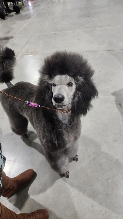 His first show was as just over 3 months old in the Novice puppy class at the United Poodle Association Specialty October 3, 2024 where he was Best Male. At the 6 following shows that weekend he held his own with the more mature puppies winning Best of Breed at 3 of the shows. We continued to show him in Novice puppy at any of the shows that we had other dogs entered.